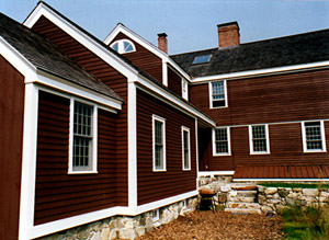 | The main body of the Ellis house, a unique plank house on the Charles River, dates to the time of the Revolution but the small cape style wing with massive summer beam and gunstock corner posts was much earlier. Only a few of these beams could be salvaged and were used in the reconstruction of the cape wing as the core of a new addition built as if it were a series of smaller additions. After structural reinforcement of the main house roof, a new red cedar shingle roof was installed as well as new siding and trim. |